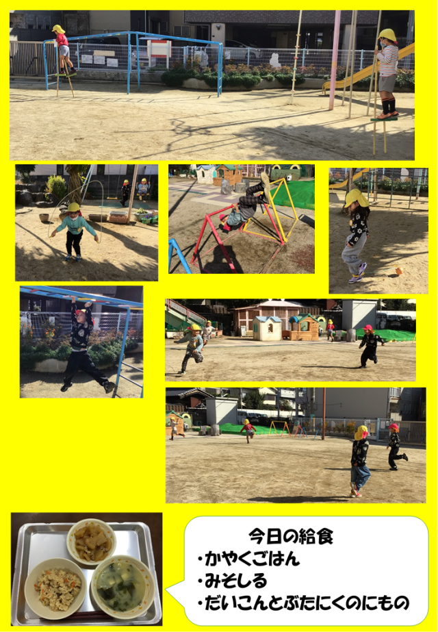 子どもたちのチャレンジは続いています!新たな目標をもち、それに向けて繰り返し挑戦している子どもたち!友だちが記録を更新すると「すごいね!やったね!」と声を掛け合う姿が微笑ましく、友だちが一緒に喜んでくれることで、さらに意欲が湧いています。また、みんなでする鬼ごっこも大好きな子どもたち。今日はどんな鬼ごっこをしようか、誰が鬼になるか話し合ったり、自分たちで進めていこうという気持ちが感じられます。園庭を存分に走ると心地よい汗もかき「あ~楽しかった」という声が聞こえてきます。明日も、元気いっぱい遊ぼうね!