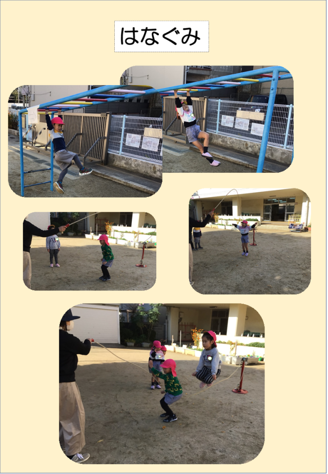 今日はとても暖かく子どもたちも元気いっぱい園庭で自分の好きな遊びを楽しみました。「大縄跳びしたい!」「二人とびしよう!」「一緒にうんていしよう!」と、友だちに声をかけて誘う姿が見られました。一つの遊びを何回も繰り返し「先生見て!」「数えて!」と意欲的に遊ぶはな組さんたちです。