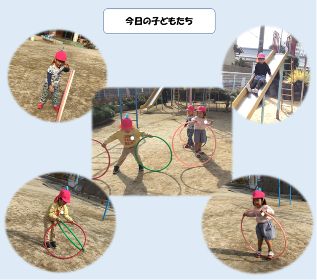 今日はフラフープで遊びました。「はな組さんみたいでしょ」とはな組さんが運動会でしていたのを真似をしたり