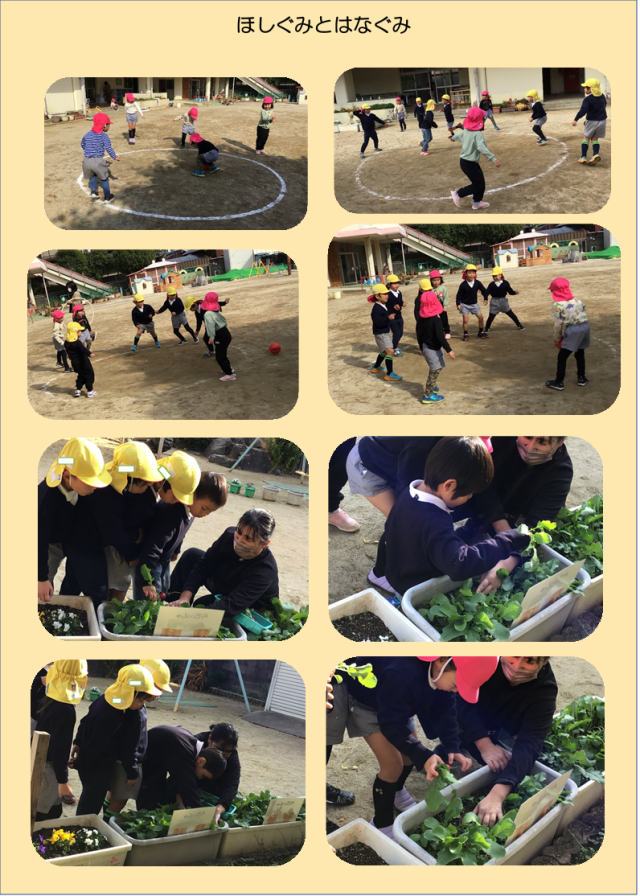 今日も12月とは思えないくらい暖かい園庭ではな組が円形ドッジをしていると、「入れて!」とほし組さんたちが仲間入り!「前にやったことあるなー」「はなの時やった!」「当たったら外にでるんやろ」と思いだしながら遊びがスタート。早く飛んでくるボールからみんな必死で逃げています。「早く投げれるんや!」とほし組さんに言われて嬉しそうなはな組さんたち。「ほし組さん早いから当たれへん…」と言われて上手くボールをよけるほし組さんたち。一緒に遊ぶ中で互いを認め合う姿がとても微笑ましく感じられました。