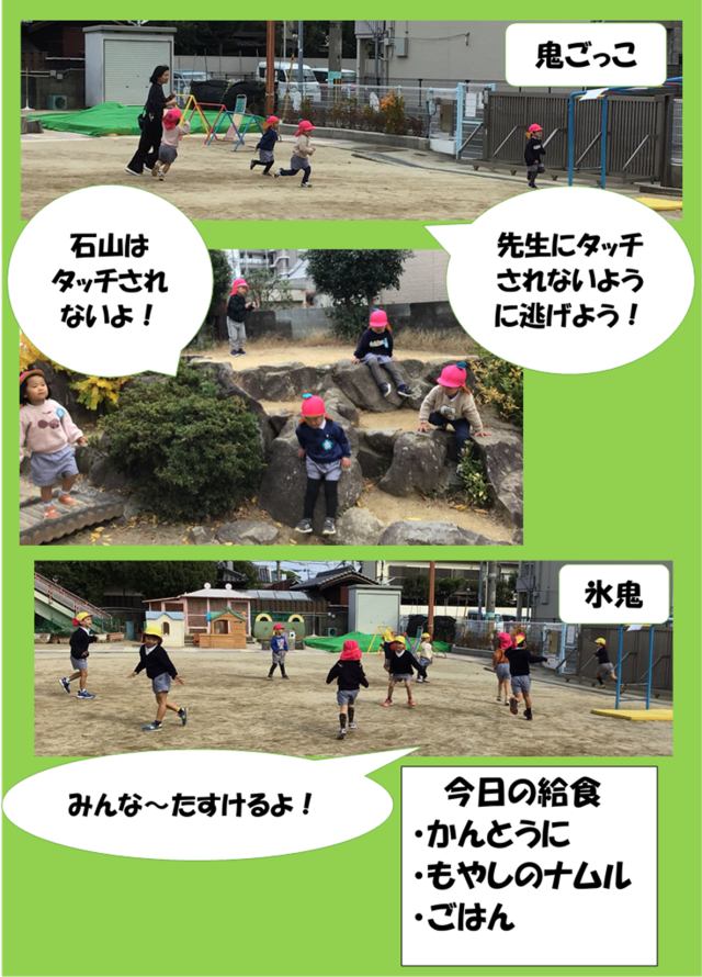 今朝から気温が下がりましたが、子どもたちは元気いっぱいです!にじ組さんは、先生と一緒に鬼ごっこをしました!先生ににつかまらないように逃げる中で「石山は鬼にタッチされない休憩場所」と子どもたちが考え、ほっと一休みする場面もありました(*^▽^*)はな組、ほし組は「今日は寒いから氷鬼しよう!」という友だちの声にみんな集まり氷鬼が始まりました。鬼にタッチされてしまった子どもを助けようとみんな鬼の動きを見てたくさんの友だちを助けていましたよ!鬼の子どもたちも力を合わせてたくさんの友だちをタッチしていました(*^▽^*)