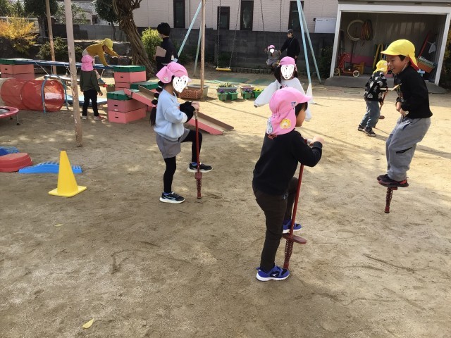 他にも、大繩、ホッピング、バランスウォーカー、一本歯下駄、登り棒、お山・・・などの遊びがたくさん!みんな自分のやりたい遊びで遊びます。