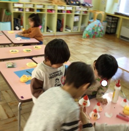 「サンタさん、来るかな?」「プレゼントはなにかな?」「夜、こっそり来るんだよね。」と、製作をしながらサンタさんの話で会話が広がっています。はさみを動かす手も、糊をつける指先も、ワクワクした気持ちが伝わってくるようです。