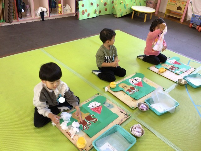 サンタさんやツリー、雪だるまなど、年齢に合わせた素材や作り方で製作中です。