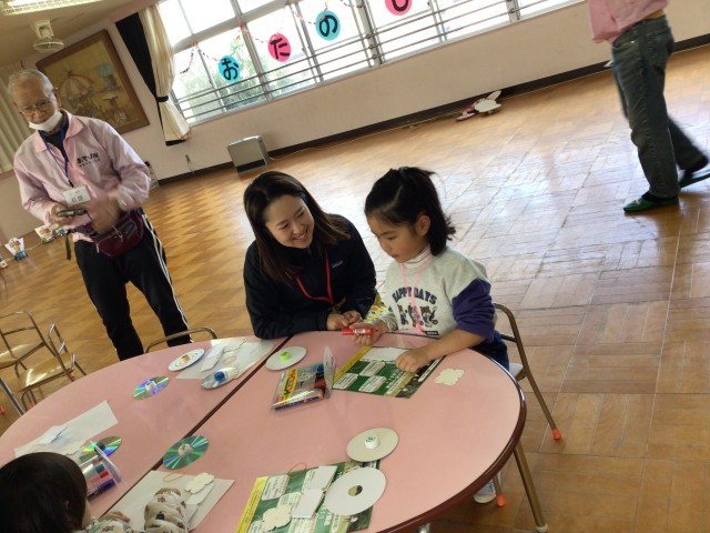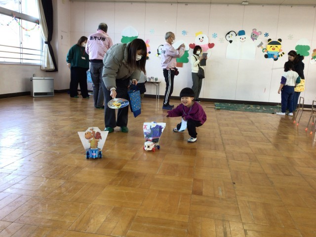 ホールでは、ぶんぶんごまやCDごま、風車づくり、射的、皿回し、こま回しなど、どのコーナーも子どもたちの「やってみたい」がいっぱい。初めて触れる遊びに、目を輝かせながら何度も挑戦する姿が見られました。