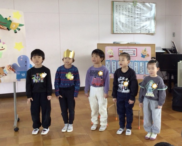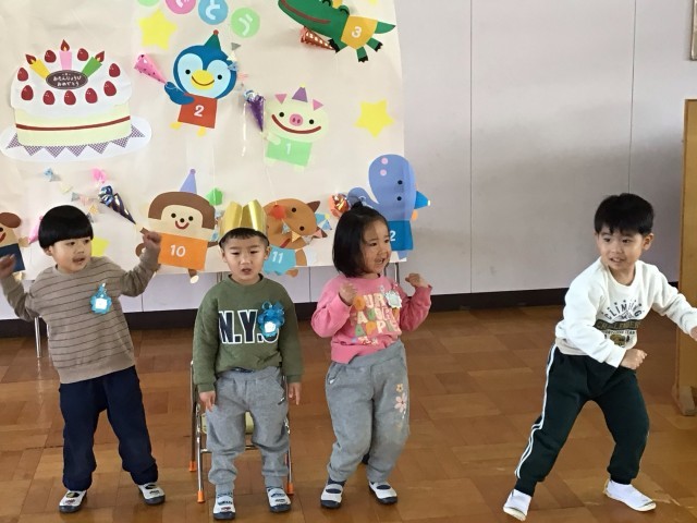今日は1月生まれのお誕生会と、先月お休みしていた12月生まれのお誕生会をホールで行いました。