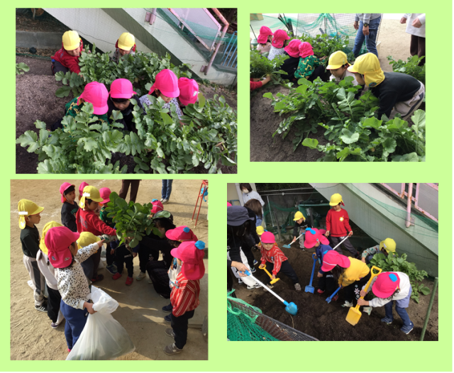 今日はみんなが毎日水やりをしたり、肥料を入れたりしながら育ててきた大根の収穫の日!「やったー!早くしよう‼」とわくわく感でいっぱいの子どもたちは大根の収穫の仕方を聞く姿も真剣そのもの!早速大根を両手で挟んで、ゆらゆら揺らしながら引っ張ると・・・スコーン!!と抜けて真っすぐに伸びた大きな大根や、足のようになっている大根、虫がかじった大根、小さい大根など、長さも太さも形も違う大根が収穫できました。メジャーで測ってみると葉っぱから根っこの先まで70㎝ある大根もあって、大きく育った大根にみんな大喜びでした。次は何を植えようか…と、抜いた後の土づくりにも力が入る子どもたちでした。