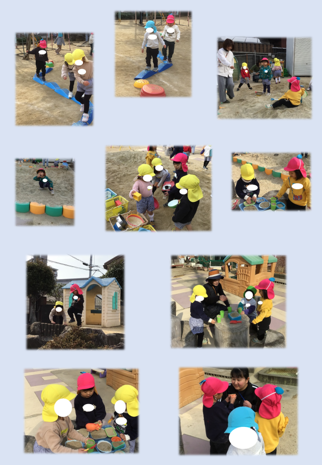 砂場ではご馳走を作ったり、石山に一緒に登ったり、ブランコや滑り台、サーキットコースにも挑戦したりするなど、他園の先生や友だちと一緒に体を動かして遊ぶ姿が見られました。
