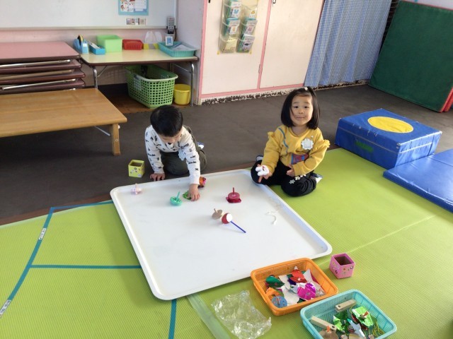 こま遊びでは、何度もこまを回してみながら「まわった!」「できたよ!」と嬉しそうな声が聞こえてきました。友だちの様子を見ながら、真似してやってみようとする姿も見られました。