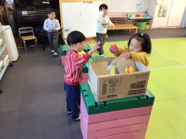 また、巧技台を組み合わせてコースを作り、ボール転がし遊びをして遊ぶ子どもたちの姿も見られました。
