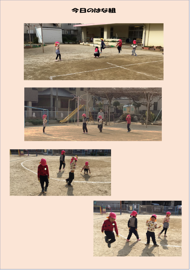 昨日の暖かさが少し残っている園庭で今日も元気いっぱい体を動かして遊びました。ドッジボールの後で年長児が縄跳びをしているのを見て『やりたい!』という気持ちが高まってきたはな組の子どもたち。早速なわとびを持ってきて跳び始めます。「1回跳べた!」「先生、数えて!」何回も繰り返しチャレンジして「はぁーしんどい・・・」でも、表情はとってもにこやか。「楽しいからお昼からもする!」と意欲をみせる子どもたちです。明日も一緒に遊ぼうね(#^.^#)