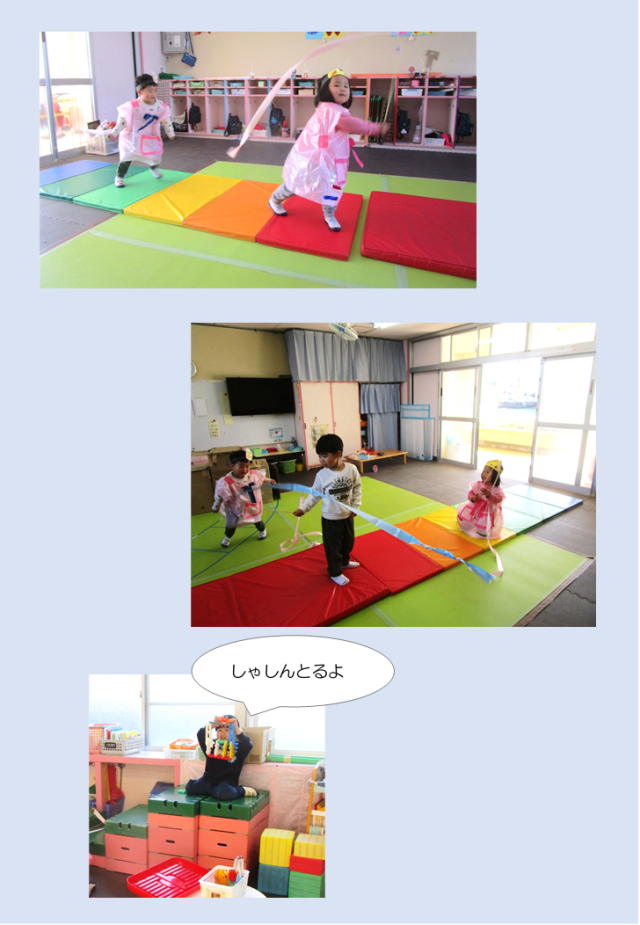今日は「プリンセスになりたい!」と、自分で作ったドレスを身に付け、嬉しそうに踊り始めた子どもたち。くるくる回ったり、ポーズを決めたりしながら自分なりに表現を楽しんでいました。