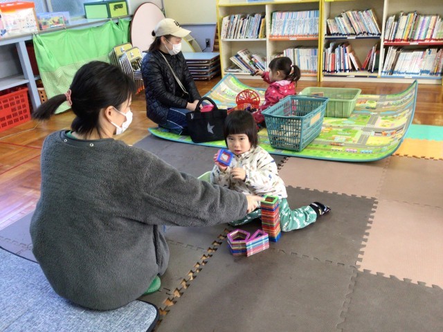 お部屋では、カラーボール遊びやままごと、ひな祭り製作、電車やブロック遊びなど、思い思いの遊びを楽しんでいました。好きな遊びを見つけてお家の方と一緒に遊ぶ姿がとても可愛らしかったです。