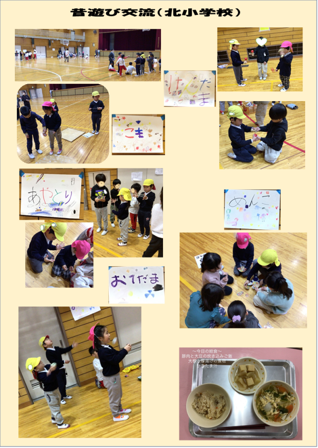 今日は北小学校の昔遊び交流に誘って頂き、海塚保育所のお友だちと一緒にいろいろな遊びを楽しみました。外は雨模様でしたが楽しみにしていたこともあり、傘をさして歩く姿もどことなく嬉しそう!小学校に着き体育館に向かうと1年生のみんなが「あ!幼稚園の子、きたー」と出迎えてくれました。先に着いていた海塚保育所ののお友だちとも元気に挨拶。すぐにグループに分かれて1年生の準備を待っていると「少し早いけど始めましょう!」と、1年生の先生のお話が始まりました。1年生に案内してもらってグループごとに各コーナーの遊びを楽しみます。「こまのひも巻ける?」「けんだまの持ち方はな…」と優しく教えてくれるお兄さん、お姉さんの言葉を真剣に聞いてやってみようとする姿がたくさん見られました。楽しい時間はあっという間に過ぎてしまい、お互いが「楽しかった!」「喜んでくれてよかった!」と感じたことを伝え合いました。北小学校の先生方、1年生の皆さん楽しい交流になるよういろいろ考えて頂きありがとうございました。海塚保育所のお友だちともまた一緒に遊べる日を楽しみにしています。明日は誕生日会があります。みんなでお祝いしましょうね。