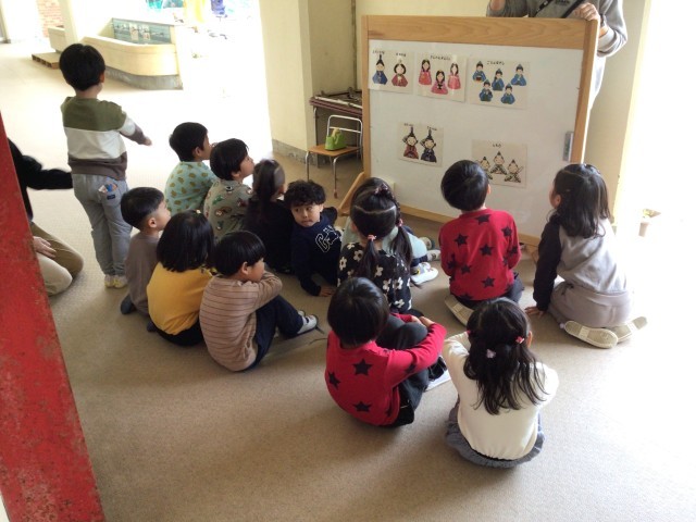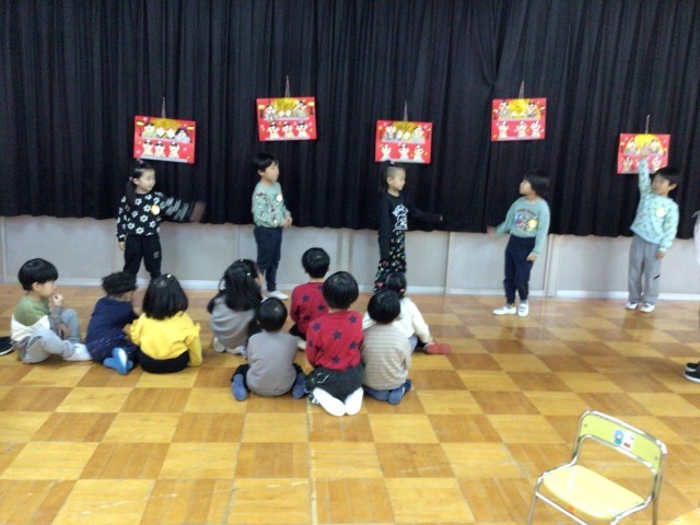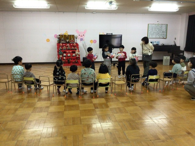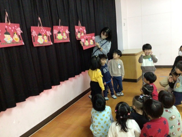 はじめに、各クラスが自分で作ったお雛様の見せ合いっこ。にじ組さんのお雛様を見たはな組さんやほし組さんからは「かわいい!」の声がたくさん聞かれました。