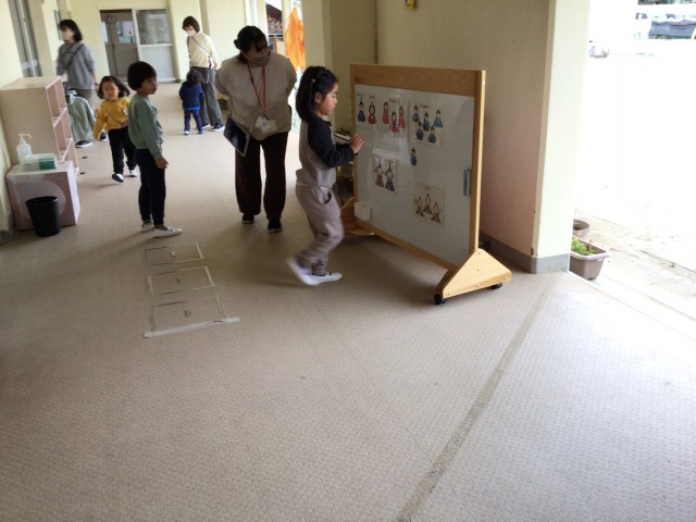 動画を観たあと、先生から「ほし組さんがいつも遊んでいる雛人形がお部屋からいなくなってるみたい」と聞くと、子どもたちは「えー!」「どこだろう?」とびっくり!「みんなで探そう!」と、声をかけ合いながら園内を探すことに・・・。