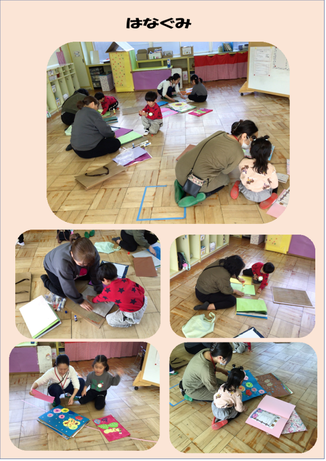 今日はおうちの人と一緒に1年間自分たちが描いた絵や作品を1冊の本にしました。昨日までに子どもたちと作品を整理しながら「あ!お花作ったなぁ!」「うさぎかわいい!」「これ夏に手形押したやつや!」など、一人一人お気に入りの絵を見つけたり、友だちと見せ合ったりする姿が見られました。おうちの人にも「これ、絵の具落として作ったねん!」と自分から話したり、「これはどうやって描いたん?」と聞かれて「えーと、ハンコみたいに押した・・・かなぁ」とちょっと自信なさげに説明したりして和やかな雰囲気の中、親子で協力しながら作り終えることができました。今年度はいろいろな素材に触れ、感触や使い方などを楽しんだり、自分なりに考えたり、工夫したりしながら一つ一つ丁寧に取り組んできました。おうちでもお子さんと一緒に作品を見ながら1年を振り返ったり、作り方に触れたりしながら楽しんでくださいね。世界で一つの作品ブックを作っていただきありがとうございました。明日はみんなが楽しみにしているお別れ遠足です。明日も元気にいっぱい遊ぼうね‼