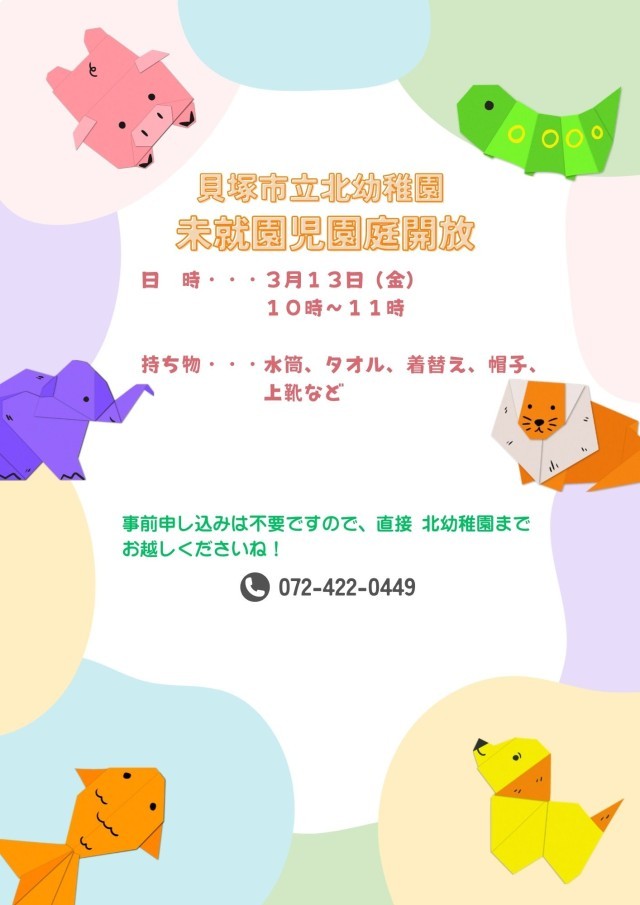 事前申し込みは不要ですので、ぜひ北幼稚園に遊びに来てくださいね。