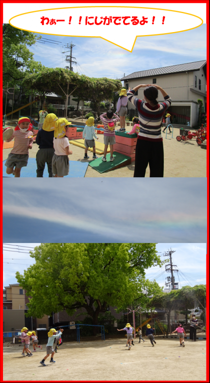 でき上がったものを持って外に飛び出てきた3歳児さん。棒についた吹流しを持って走ると風に乗ってなびきます。それを見て大喜びの3歳児の子どもたちは、園庭をずっとずっと走っていました。心地よい風を感じ、自分で作ったもので遊べる楽しさを感じられたようです。
