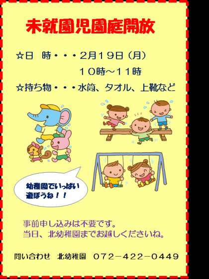 時間は10時〜11時です。申し込みは不要ですので、北幼稚園に遊びに来てくださいね♪