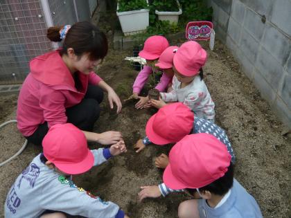 5月10日(月) 今日ははな組さんはトマトの苗植えと、ひまわりの種。ほし組さん...
