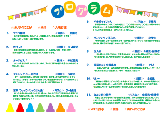 運動会は9:15開始、11:30頃終了予定です。小学校の校庭で行います。