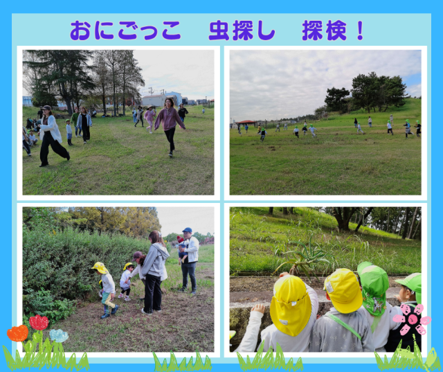 記念写真を撮った後、みんなで鬼ごっこをしたり虫探しやどんぐり拾いを楽しんだり。