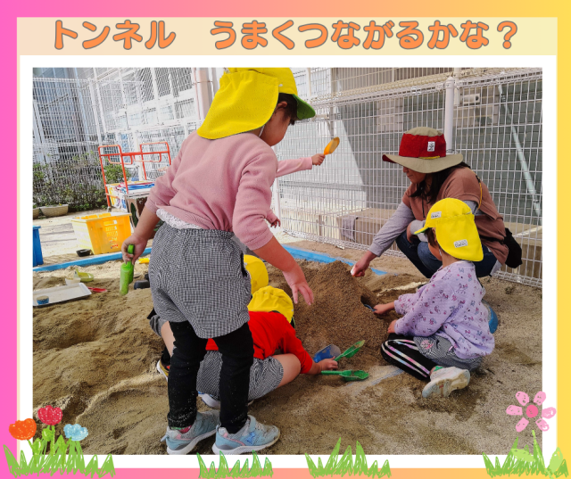 砂の山にトンネルをつくり始めました。これがなかなか上手。あっちからと、こっちから・・・うまくつながったかな?