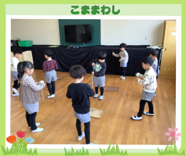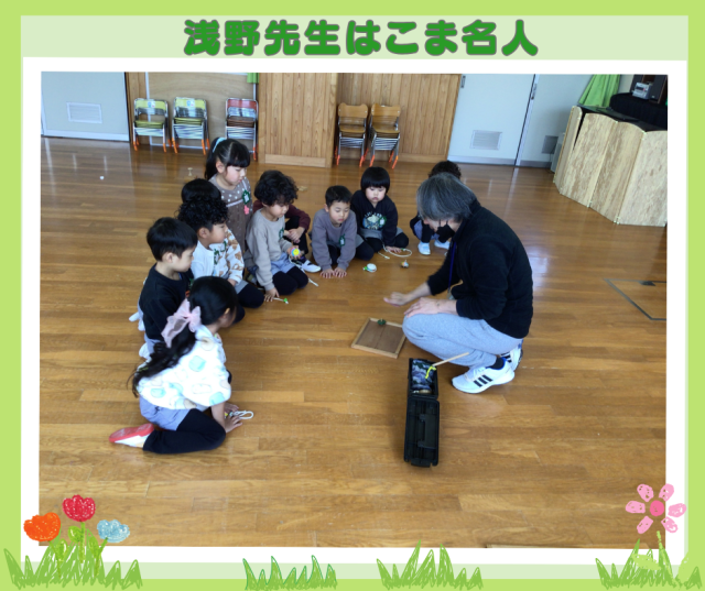 今日はコマの回し方や、チャレンジ遊びを教えてくれました。