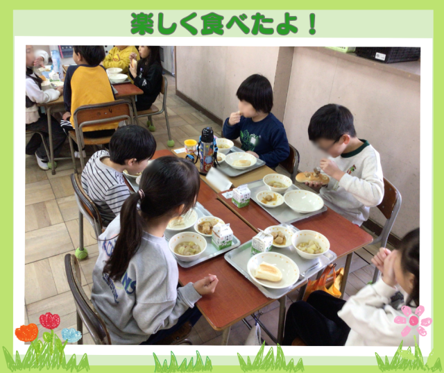 「給食を一緒に食べましょう」とのことで、ウキウキしながら「いってきま~す」と1年生の教室へ歩いていきました。