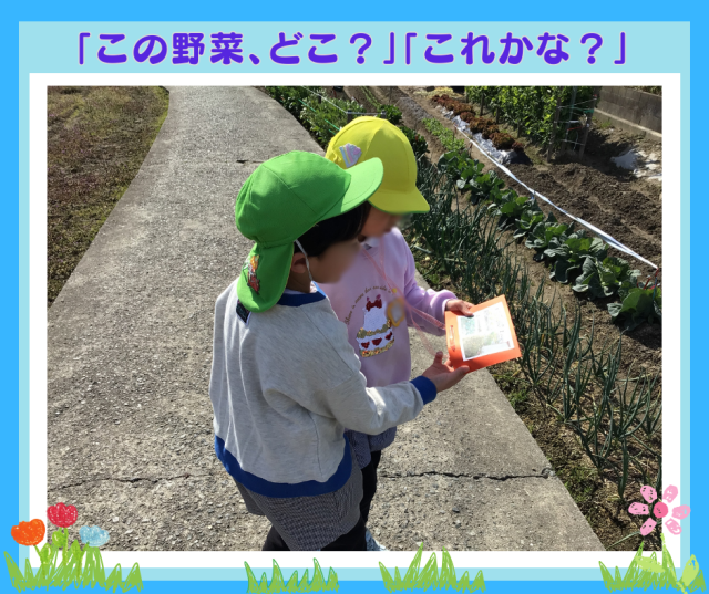 園の近所の、あまり車が通らない田んぼ道を子ども二人で手をつないで、畑に植えられている野菜や果物を探すミッション、楽しめていました。