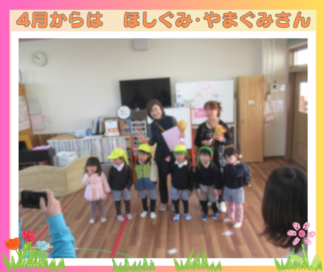4月になったらほしぐみさん、やまぐみさんです。新しいはなぐみさんも加わり、さらにパワーアップ!