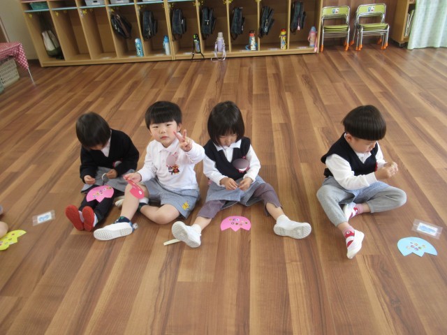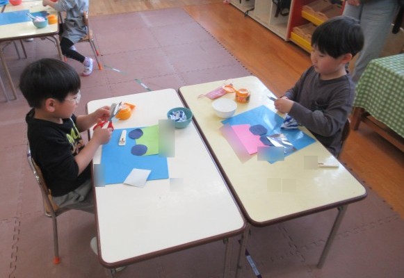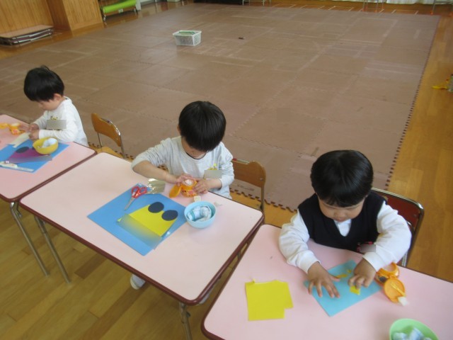 やま組さんとほし組さんは、はさみと糊を使って誕生表を作りました。自分ができたものを「見て見て~♪」と嬉しそうに先生に見せていました*^^*