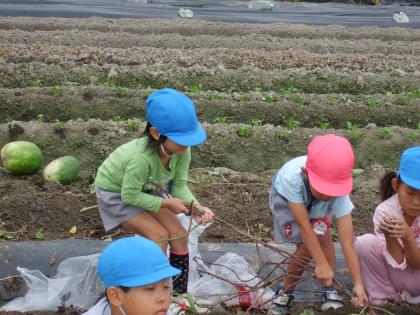 幼稚園でビニール袋を用意して、ハサミを持って、畑へGo!