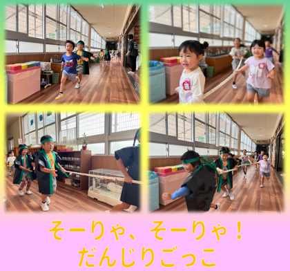 「おはよう!」登園するとすぐにだんじりごっこが始まります。 まといや綱を持って「...